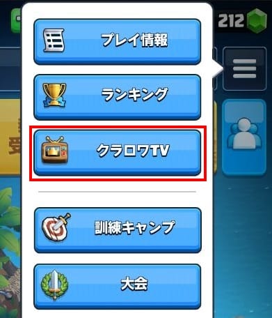 レベルの高い人同士の戦いを見ることが可能だ。やり方は以下の通り。①右上マークをタップし、クラロワTVをタップ。