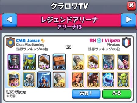 一番上のレジェンドアリーナの順位が高いプレイヤーの試合を見るといい。